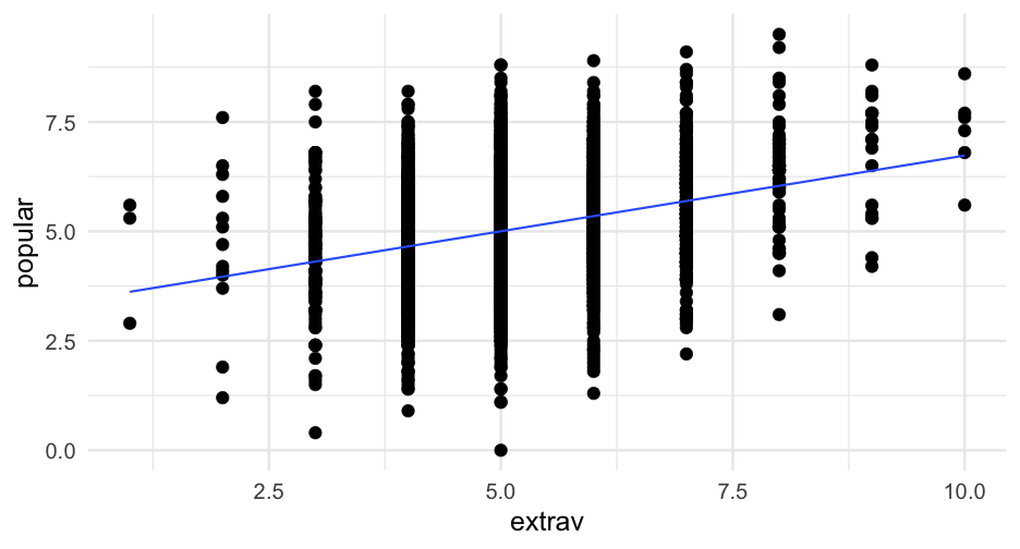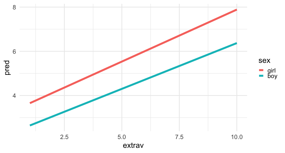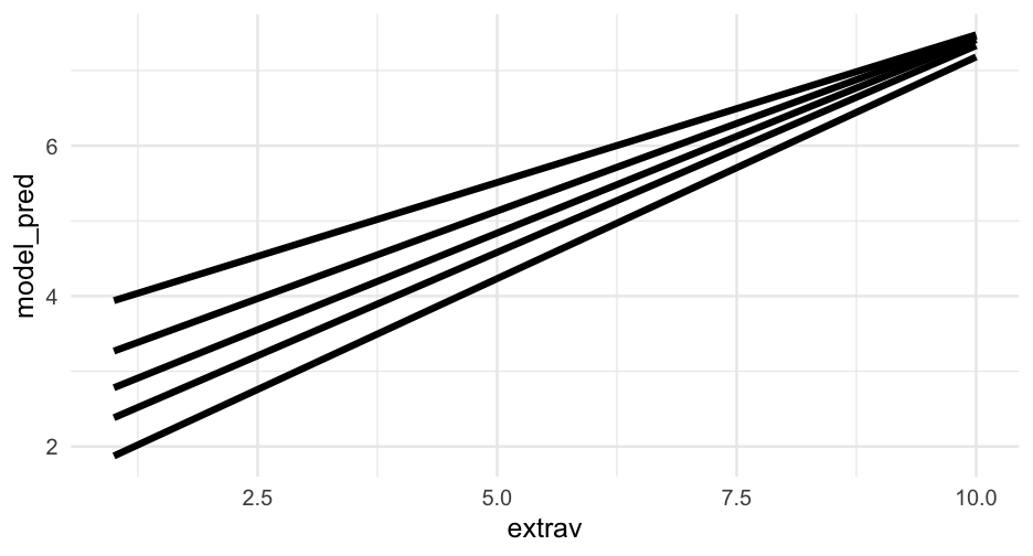 class: center, middle, inverse, title-slide # Review & Intro to GH Notation ### Daniel Anderson ### Week 4 --- layout: true <script> feather.replace() </script> <div class="slides-footer"> <span> <a class = "footer-icon-link" href = "https://github.com/datalorax/mlm2/raw/main/static/slides/w4p1.pdf"> <i class = "footer-icon" data-feather="download"></i> </a> <a class = "footer-icon-link" href = "https://mlm2.netlify.app/slides/w4p1.html"> <i class = "footer-icon" data-feather="link"></i> </a> <a class = "footer-icon-link" href = "https://mlm2-2021.netlify.app"> <i class = "footer-icon" data-feather="globe"></i> </a> <a class = "footer-icon-link" href = "https://github.com/datalorax/mlm2"> <i class = "footer-icon" data-feather="github"></i> </a> </span> </div> --- # Agenda * Review Homework 1 * Review the most important parts of Week 3 content * Discuss Gelman and Hill notation - contrast with Raudenbush and Bryk * Unstructured VCV Matrices and alternatives --- # Learning Objectives * Understand at least the basics of the GH notation and why I view it as preferable * Gain a deeper understanding of how the residual structure is different in multilevel models * Understand that there are methods for changing the residual structure, and understand when and why this might be preferable * Have a basic understanding of implementing alternative methods --- class: inverse-blue middle # Review Homework 1 --- class: inverse-red middle # Review Week 3 content --- # Data and model ```r library(tidyverse) library(lme4) popular <- read_csv(here::here("data", "popularity.csv")) m <- lmer(popular ~ extrav + (extrav|class), popular, control = lmerControl(optimizer = "bobyqa")) ``` `extrav` is a measure of extraversion. What is this model fitting, in plain English? --- # Model summary ```r arm::display(m) ``` ``` ## lmer(formula = popular ~ extrav + (extrav | class), data = popular, ## control = lmerControl(optimizer = "bobyqa")) ## coef.est coef.se ## (Intercept) 2.46 0.20 ## extrav 0.49 0.03 ## ## Error terms: ## Groups Name Std.Dev. Corr ## class (Intercept) 1.73 ## extrav 0.16 -0.97 ## Residual 0.95 ## --- ## number of obs: 2000, groups: class, 100 ## AIC = 5791.4, DIC = 5762 ## deviance = 5770.7 ``` --- # Let's walk through * By way of thinking through it, let's compare to simple linear regression -- ```r slr <- lm(popular ~ extrav, popular) arm::display(slr) ``` ``` ## lm(formula = popular ~ extrav, data = popular) ## coef.est coef.se ## (Intercept) 3.27 0.12 ## extrav 0.35 0.02 ## --- ## n = 2000, k = 2 ## residual sd = 1.31, R-Squared = 0.10 ``` --- # Visually ```r ggplot(popular, aes(extrav, popular)) + geom_point() + geom_smooth(se = FALSE, method = "lm") ``` <!-- --> --- # Making predictions $$ \operatorname{\widehat{popular}} = 3.27 + 0.35(\operatorname{extrav}) $$ -- Scores of 0 to 5 $$ \operatorname{\widehat{popular}} = 3.27 + 0.35 \times 0 = 3.27 $$ $$ \operatorname{\widehat{popular}} = 3.27 + 0.35 \times 1 = 3.62 $$ $$ \operatorname{\widehat{popular}} = 3.27 + 0.35 \times 2 = 3.97 $$ $$ \operatorname{\widehat{popular}} = 3.27 + 0.35 \times 3 = 4.32 $$ $$ \operatorname{\widehat{popular}} = 3.27 + 0.35 \times 4 = 4.67 $$ $$ \operatorname{\widehat{popular}} = 3.27 + 0.35 \times 5 = 5.02 $$ --- # Now for the mlm It's more complicated now for a couple of reasons * Each `class` has their own intercept and slope. Which class is the student in? * What if we want to make a prediction for someone outside our sample? -- Let's walk through 4 predictions --- # Sample preds ```r sample_preds <- popular %>% group_by(class) %>% slice(1) %>% ungroup() %>% slice(1:4) sample_preds ``` ``` ## # A tibble: 4 x 7 ## pupil class extrav sex texp popular popteach ## <dbl> <dbl> <dbl> <chr> <dbl> <dbl> <dbl> ## 1 1 1 5 girl 24 6.3 6 ## 2 1 2 8 girl 14 6.4 6 ## 3 1 3 5 boy 13 4.2 4 ## 4 1 4 3 girl 20 4.1 4 ``` --- # Coefficients $$ `\begin{aligned} \operatorname{\widehat{popular}}_{i} &\sim N \left(\mu, \sigma^2 \right) \\ \mu &=2.46_{\alpha_{j[i]}} + 0.49_{\beta_{1j[i]}}(\operatorname{extrav}) \\ \left( \begin{array}{c} \begin{aligned} &\alpha_{j} \\ &\beta_{1j} \end{aligned} \end{array} \right) &\sim N \left( \left( \begin{array}{c} \begin{aligned} &0 \\ &0 \end{aligned} \end{array} \right) , \left( \begin{array}{cc} 1.73 & -0.97 \\ -0.97 & 0.16 \end{array} \right) \right) \text{, for class j = 1,} \dots \text{,J} \end{aligned}` $$ --- # Grab params Fixed effects ```r f <- fixef(m) f ``` ``` ## (Intercept) extrav ## 2.4610234 0.4928571 ``` -- classroom deviations ```r r <- ranef(m) r ``` ``` ## $class ## (Intercept) extrav ## 1 0.34095954 -0.027014677 ## 2 -1.17798954 0.096974668 ## 3 -0.62937002 0.057097182 ## 4 1.08529708 -0.099953042 ## 5 -0.19489641 0.021601800 ## 6 -0.98339230 0.083762531 ## 7 -1.00065422 0.064825024 ## 8 -2.31344585 0.203883548 ## 9 -0.72390121 0.076936163 ## 10 0.81714889 -0.088190958 ## 11 -0.80165382 0.053642262 ## 12 -0.50559454 0.035562482 ## 13 1.94465792 -0.163675650 ## 14 -4.60442503 0.379805874 ## 15 -0.95627606 0.092420531 ## 16 -0.63300242 0.038113732 ## 17 0.39246763 -0.023686639 ## 18 2.28824205 -0.199172763 ## 19 1.11955746 -0.088677713 ## 20 0.21949255 0.001085573 ## 21 0.26728615 -0.047272343 ## 22 2.29791264 -0.192289863 ## 23 0.33161921 -0.024183133 ## 24 -1.35638924 0.114938066 ## 25 -0.01994683 -0.011555948 ## 26 -1.25402662 0.107101274 ## 27 -1.19545641 0.114147749 ## 28 -0.44502470 0.014290982 ## 29 2.03871407 -0.180129251 ## 30 -1.40054893 0.109698011 ## 31 -1.79566145 0.205412272 ## 32 -0.34719881 0.051159472 ## 33 2.12578123 -0.136367830 ## 34 -0.98425888 0.101445482 ## 35 3.63820003 -0.322359287 ## 36 0.91322197 -0.111514042 ## 37 0.30465672 -0.016094329 ## 38 -0.51579961 0.044299138 ## 39 0.61982719 -0.065503359 ## 40 -1.37549168 0.146964064 ## 41 -1.59793019 0.120798718 ## 42 0.45790261 -0.028187295 ## 43 0.71853077 -0.072570668 ## 44 -0.62247125 0.062370382 ## 45 1.35450804 -0.121366316 ## 46 0.20177100 0.005892888 ## 47 -0.02078929 -0.013791520 ## 48 -2.26606243 0.