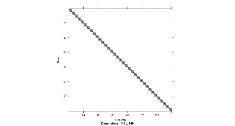 -- ```r w0 <- lmer(opp ~ time + (1|id), willett) ``` -- What does the residual variance-covariance look like? Let's use **sundry** to pull it ```r library(sundry) w0_rvcv <- pull_residual_vcov(w0) ``` --- # Image Sparse matrix - we can view it with `image()` ```r image(w0_rvcv) ``` <!-- --> --- # Pull first few rows/cols ```r w0_rvcv[1:8, 1:8] ``` ``` ## 8 x 8 sparse Matrix of class "dgCMatrix" ## 1 2 3 4 5 6 7 8 ## 1 1280.7065 904.8054 904.8054 904.8054 . . . . ## 2 904.8054 1280.7065 904.8054 904.8054 . . . . ## 3 904.8054 904.8054 1280.7065 904.8054 . . . . ## 4 904.8054 904.8054 904.8054 1280.7065 . . . . ## 5 . . . . 1280.7065 904.8054 904.8054 904.8054 ## 6 . . . . 904.8054 1280.7065 904.8054 904.8054 ## 7 . . . . 904.8054 904.8054 1280.7065 904.8054 ## 8 . . . . 904.8054 904.8054 904.8054 1280.7065 ``` --- class: inverse-green middle # Next time ## Modeling growth (part 1) ### Also Homework 2 is assigned