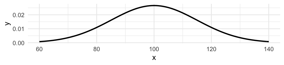 ## [1] 82 80 88 108 116 117 132 71 75 93 95 88 111 63 77 86 83 93 97 87 94 96 112 113 106 107 98IQ scores are generally assumed to be generated from a distribution that looks like this: