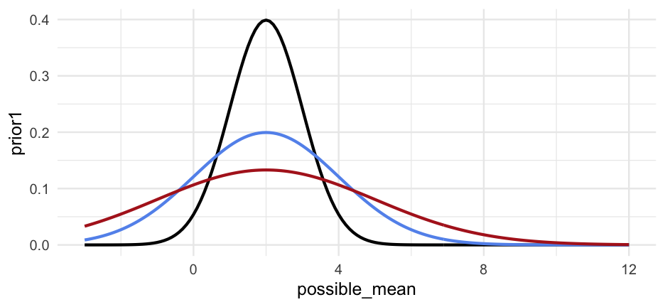 prior <- dnorm(grid$possible_mean, mean = 2, sd = 1)grid %>% mutate(prior1 = dnorm(possible_mean, mean = 2, sd = 1), prior2 = dnorm(possible_mean, mean = 2, sd = 2), prior3 = dnorm(possible_mean, mean = 2, sd = 3)) %>% ggplot(aes(possible_mean)) + geom_line(aes(y = prior1)) + geom_line(aes(y = prior2), color = "cornflowerblue") + geom_line(aes(y = prior3), color = "firebrick")