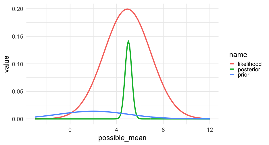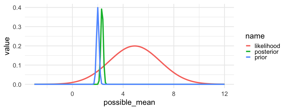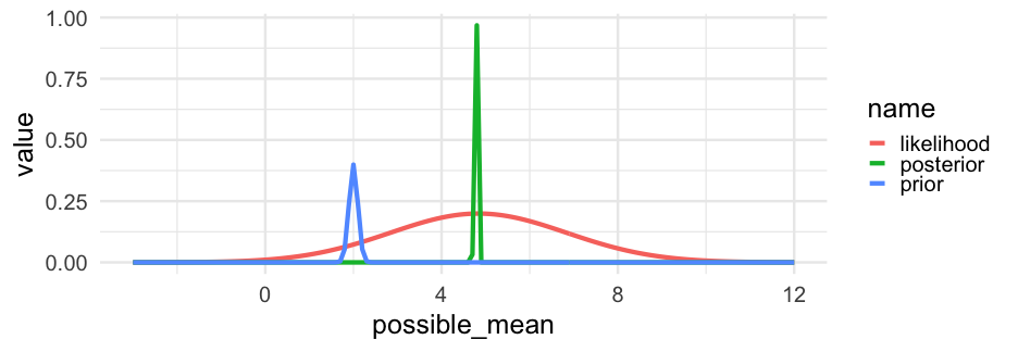 grid <- grid %>% mutate(prior = dnorm(grid$possible_mean, mean = 2, sd = 0.1), prior = prior / sum(prior), posterior = prior) # best guess before seeing datafor(i in seq_along(true_data)) { grid <- grid %>% mutate(likelihood = dnorm(true_data[i], possible_mean, 2), posterior = likelihood * posterior, posterior = posterior / sum(posterior))}true_data <- rnorm(5000, 5, 1)grid <- grid %>% mutate(prior = dnorm(grid$possible_mean, mean = 2, sd = 0.1), prior = prior / sum(prior), posterior = prior) # best guess before seeing datafor(i in seq_along(true_data)) { grid <- grid %>% mutate(likelihood = dnorm(true_data[i], possible_mean, 2), posterior = likelihood * posterior, posterior = posterior / sum(posterior))}The purpose of the prior is to include what you already know into your analysis